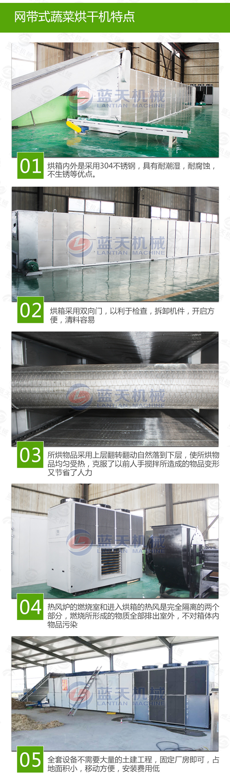一、網(wǎng)帶蔬菜烘干機(jī)是一種批量、連續(xù)式生產(chǎn)的干燥烘干設(shè)備,主要加熱方式有電加熱、蒸汽加熱、熱風(fēng)加熱。其工作方式是將要烘干的物料如蔬菜均勻的平鋪在網(wǎng)帶上,網(wǎng)帶采用12-60目的鋼絲網(wǎng)帶,由傳動裝置拖動在大型蔬菜烘干設(shè)備內(nèi)往返移動,熱風(fēng)在物料間穿流而過,水蒸氣從排濕孔中排出,從而達(dá)到干燥的目的,箱體長度由標(biāo)準(zhǔn)段組合而成,為了節(jié)約場地,可將烘干機(jī)制成多層式,常見的有二室三層、二室五層、長度6-40m,有效寬度0.6-3.0m。